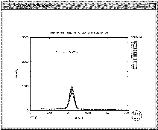 The principal program options now reappear and a sequence of runs and subpatterns may then be treated with the T or U command depending on whether the starting parameters are to be reinitialised or not. The program will treat ascending or descending series, to allow the best, but disappearing, peaks to be used to set the initial search state. When fitting becomes progressively more difficult certain parameters, notably the position, should be held fixed (step 0.0) which will limit the program from diverging when the peak is really difficult to resolve distinctly.